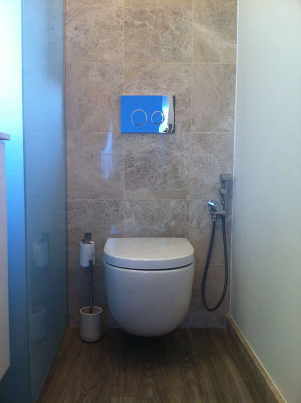 En este post podemos comprobar cómo un cuarto de baño de pequeñas dimensiones queda muy coqueto con un inodoro suspendido y con una grifería para el aseo personal.